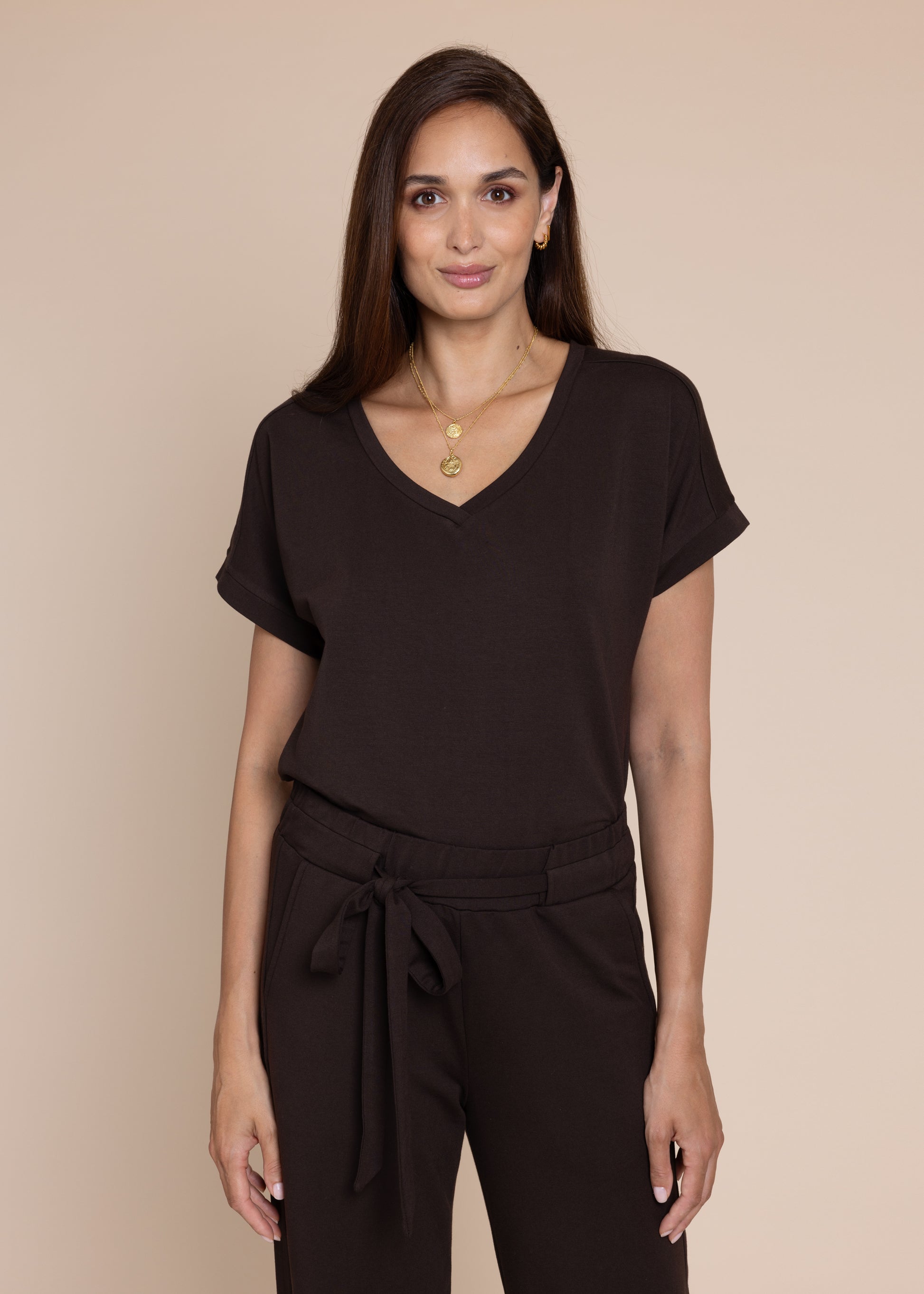 ATHENA v-neck, short sleeve top, chocolate